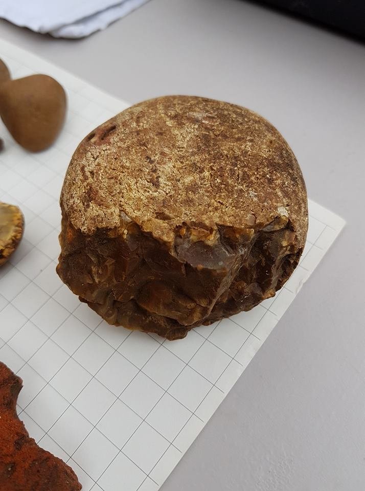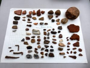The first layer yielded nothing, but the second layer yielded some pottery and metalwork, mostly 18th century, which is contemporary with the barn that was there before the church. After removing tree roots which obscured the third spit, older finds started to be revealed: pottery sherds including late 12th – 14th century Hertfordshire Greyware, a sherd from medieval green glazed ware, a Roman Coarseware sherd and a possibly Early Iron Age sherd. We also found a flint cobble, shattered on one side and thought to possibly be a Paleolithic (Stone Age) “pound stone”, used to extract marrow from bones.