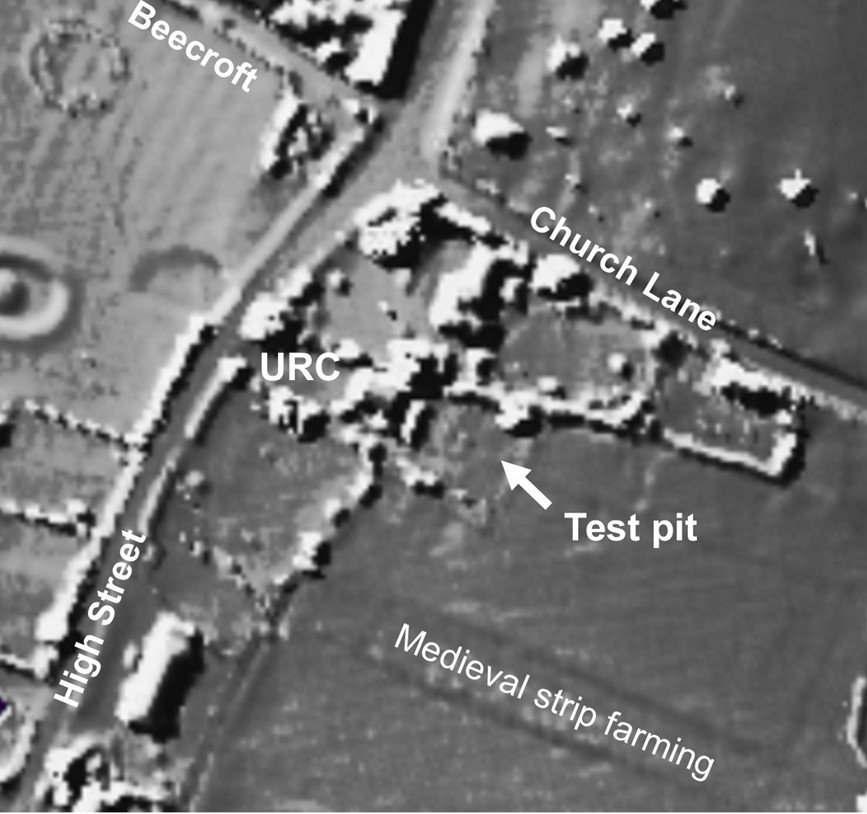 The test pit was at the back of the URC in a piece of land bought to extend the graveyard, but never used. This had been part of Bridgefoot common within which you can still see evidence of the medieval strip farming system. The URC dates from 1810, but was built around a much older barn. We believe the whole area, emcompassing Beecroft Lane, Church Lane, Bockings, Winters Lane, Totts Lane and the High Street, is the location of the original medieval village.