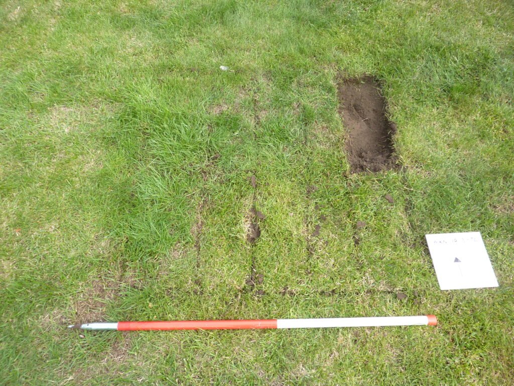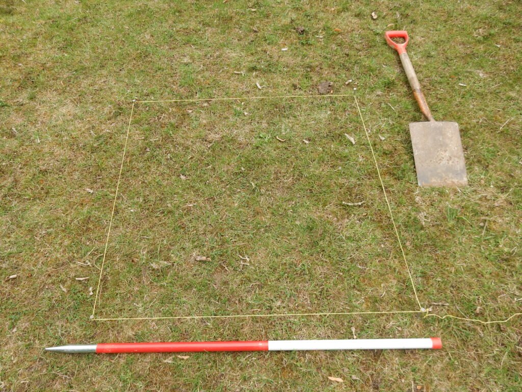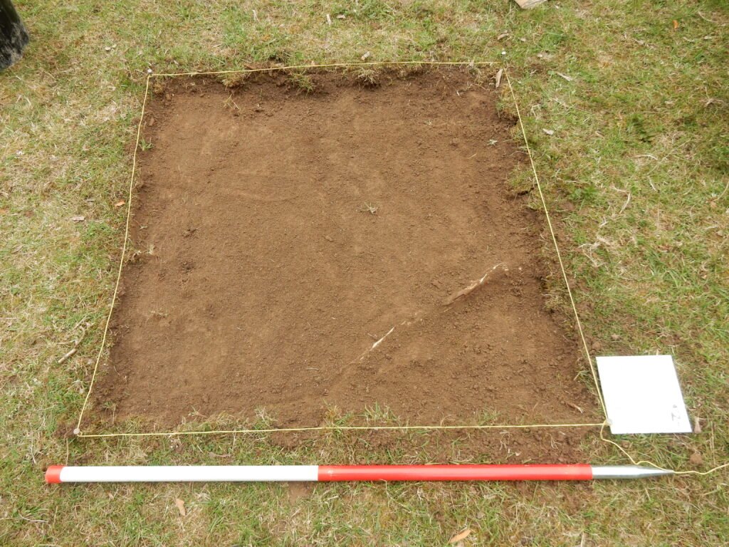 A 1 meter square is marked out for the test pit.