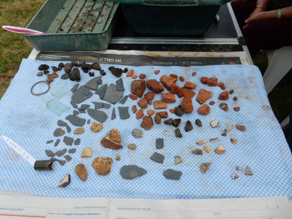 Test pits can reveal physical artefacts, typically more recent finds being at the top and then increasingly older finds as the pit gets deeper. By digging a number of pits across the village, this provides data on how the village was inhabited through history. Even if a pit reveals nothing this still tells us something about the history of that area.