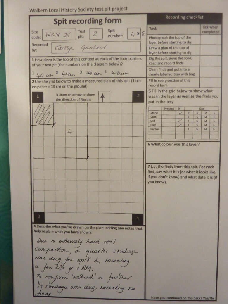 A record should also be made for each spit. This should include a drawing with description, measurements of the depth of each corner. The record should also include what was in the layer.